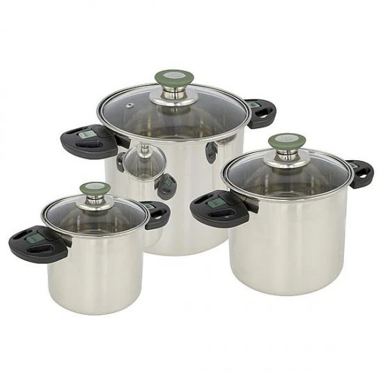 Een luxe 3-delige RVS pannenset. Iedere pan beschikt over een deksel met hittebestendige knop. Daarnaast heeft iedere pan hittebestendige en wegklapbare handgrepen. Deze handgrepen kunnen na gebruik eenvoudig in worden geklapt zodat de pannen volledig nestbaar en compact op te bergen zijn. Bespaart tot 40% ruimte! De pannen zijn smal en hoog en daardoor bij uitstek geschikt voor de beperkte ruimte op gaskomforen. Te gebruiken op de warmtebronnen gas, keramisch en elektrisch. Afmetingen (Øxh): 12×11, 16×15 en 20×19 cm. Afmetingen genest (Øxh): 20×19 cm. Inhoud: 1,25, 3 en 6 liter.