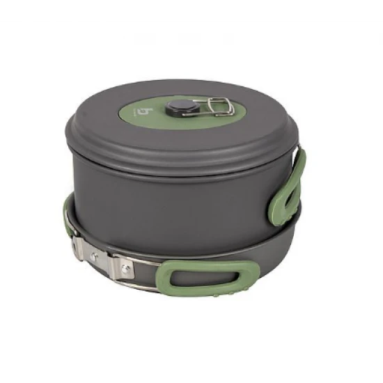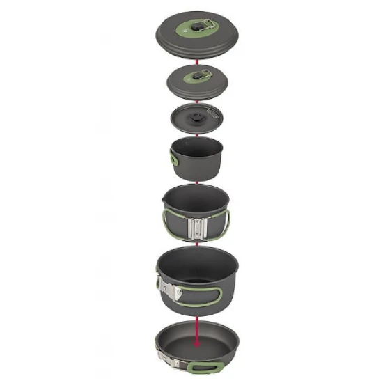 Een complete 4-delige lichtgewicht kookset. Deze pannenset bestaat uit 3 kookpannen met een deksel en een koekenpan. Bij uitstek geschikt voor outdoor gebruik. Te gebruiken op de warmtebronnen gas, keramisch, benzine en elektrisch. Gemaakt van stevig hard geanodiseerd aluminium waardoor er een verminderde kans is op aanbakken. Iedere pan is voorzien van een hittebestendige siliconen klapgreep. Deze handgrepen kunnen na gebruik eenvoudig om de pan worden geklapt zodat de pannen compact op te bergen en vervoeren zijn. Inclusief foedraal. Afmetingen kookpannen (Øxh): 13,5×7,5, 15,5×8,5 en 17,5×10,5 cm. Afmeting koekenpan (Øxh): 18×4,5 cm. Afmetingen genest (Øxh): 19×11,5 cm. Inhoud: 1,1, 1,6 en 2,5 liter.