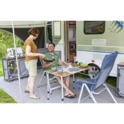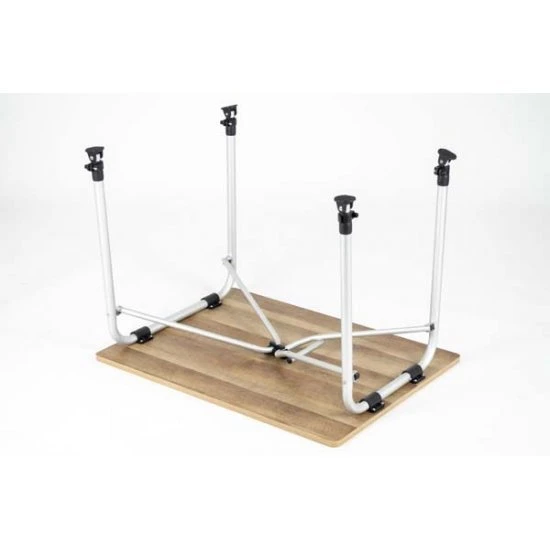 Een lichtgewicht maar zeer stabiele campingtafel. De tafel is heeft een glasfiber top met kunststof rand welke hittebestendig en watervast is. Het frame is van aluminium en de campingtafel is voorzien van voetjes met stabilisatoren zodat de tafel op iedere ondergrond stevig staat. Tevens zijn de poten in hoogte te verstellen (traploos).