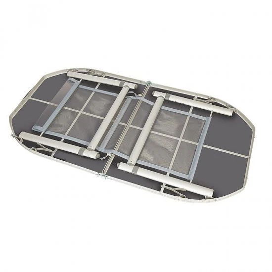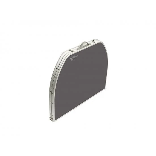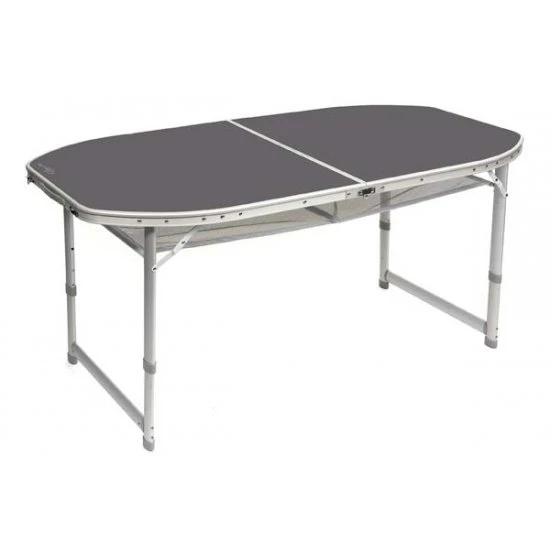 Een stabiele ovalen campingtafel. Deze tafel heeft verstelbare poten, stelschroeven voor extra fijnstelling en een deelbaar tafelblad. Hierdoor is de tafel eenvoudig op te vouwen tot koffermodel. Gemaakt van lichtgewicht aluminium. De poten zijn in 3 verschillende hoogtes verstelbaar (55/65/70 cm). Onder het tafelblad is een net bevestigd om spullen op te bergen. Ingeklapt (lxbxh): 80x75x7cm