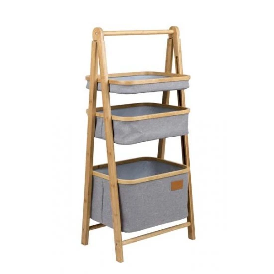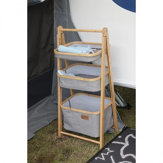 Een stijlvol kastje met 3 mandjes. Het frame is gemaakt van bamboe en de mandjes zijn gemaakt van een luxe polyester stof met een linnen look. De mandjes hebben verschillende hoogtes en zijn licht kantelbaar. Hierdoor zijn spullen eenvoudig op te bergen. Ideaal voor in de tent, maar ook voor thuis, bijvoorbeeld in de badkamer. Na gebruik is deze kast compact inklapbaar tot een hoogte van slechts 6 centimeter.