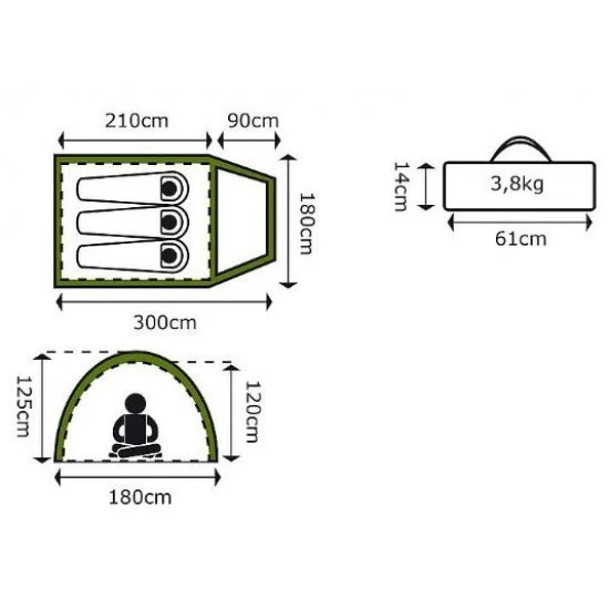 Een 3-persoons tent met een voorruimte van 90 centimeter. De buitentent is van 190T polyester tentdoek met een PU coating en een waterkolom van 3000 mm. De binnentent is gemaakt van ademend polyester. Daarnaast beschikt de tent over een PE grondzeil met 6000 mm waterkolom en over getapete naden. De tent is snel en eenvoudig op te zetten met het handige ring&pin systeem en de 8,5 mm dikke fiberglas boogstokken. De buitentent beschikt over afsluitbare mesh ventilatieopeningen met een afstandhouder en de binnentent beschikt over een dubbele deur (waarvan 1 mesh) en een doorvoer voor stekkers en aansluitingen. De ritssluiting is voorzien van een dubbele runner en in de tent bevinden zich 6 handige opbergvakken en een ophanghaak in de top. De tent wordt compleet geleverd met transporthoes, scheerlijnen en haringen. Ingepakt (Øxl): 14×61 centimeter.