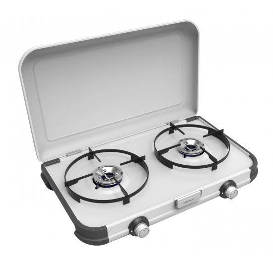 • Een stevig 2-pits gaskomfoor met stalen deksel en cartouche ventiel.