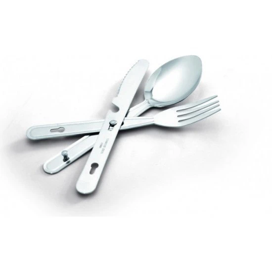 Een 3-delige roestvrij stalen bestekset. Een zeer compacte set om mee te nemen voor onderweg. Deze set, een mes, vork en lepel, zijn eenvoudig aan elkaar te bevestigen door middel van een schuifnagel.