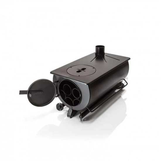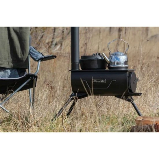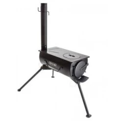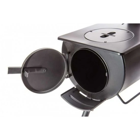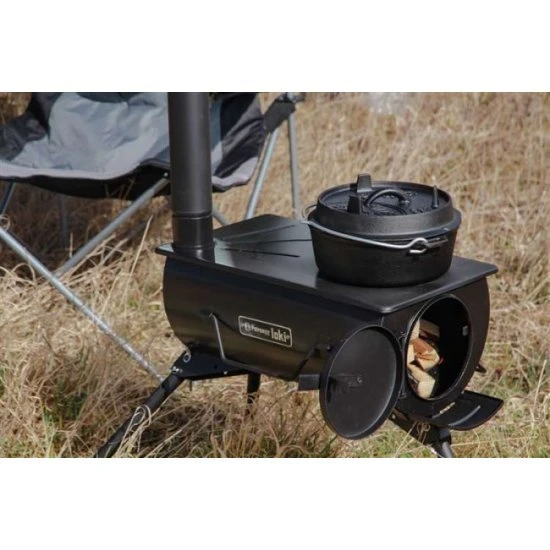 Camping stove en tentkachel in één. 40 x 25 cm kookoppervlak. Gewicht 12 kg. gecoat staal zwart. Transportmaten 52 cm. x 33 cm. x 33 cm.