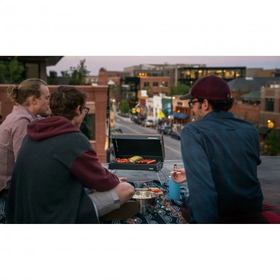 Een gebruiksvriendelijke en draagbare barbecue, net zo vertrouwd als uw barbecue in de achtertuin, maar met één hand te dragen. Deze kampgrill heeft het gemak en de prestaties van gasgrillen binnen handbereik. Licht en compact, maar toch groot genoeg voor die ribeyes, deze grill schroeit, roostert en bakt. De inklapbare poten vergrendelen in de rechtopstaande positie om waardevolle extra tafelruimte te bieden tijdens het koken en Kuchoma vuurt gemakkelijk aan met een piëzo-ontsteker met drukknop. De horizontale branderbuis zorgt voor gelijkmatige warmte en 8500 BTU (2500 W) grillvermogen, terwijl de diepe stalen kap warmte en smaak afdicht terwijl u uw voedsel indirect kookt. Als je klaar bent met grillen, maken het verwijderbare keramische grillrooster met antiaanbaklaag en de roestvrijstalen lekbak het schoonmaken eenvoudig. Het slot en de handgreep maken het dragen van de grill eenvoudig en laat één hand vrij om je ijzige drank te dragen.